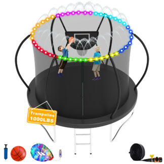 Elitezip 10FT 12FT 14FT 16FT Trampoline for Kids Adults, Outdoor Trampolines with Enclosure Net, Basketball Hoop, Light, Sprinkler, Ladder, Backyard Recreational Trampoline, 1000LBS, Galvanized